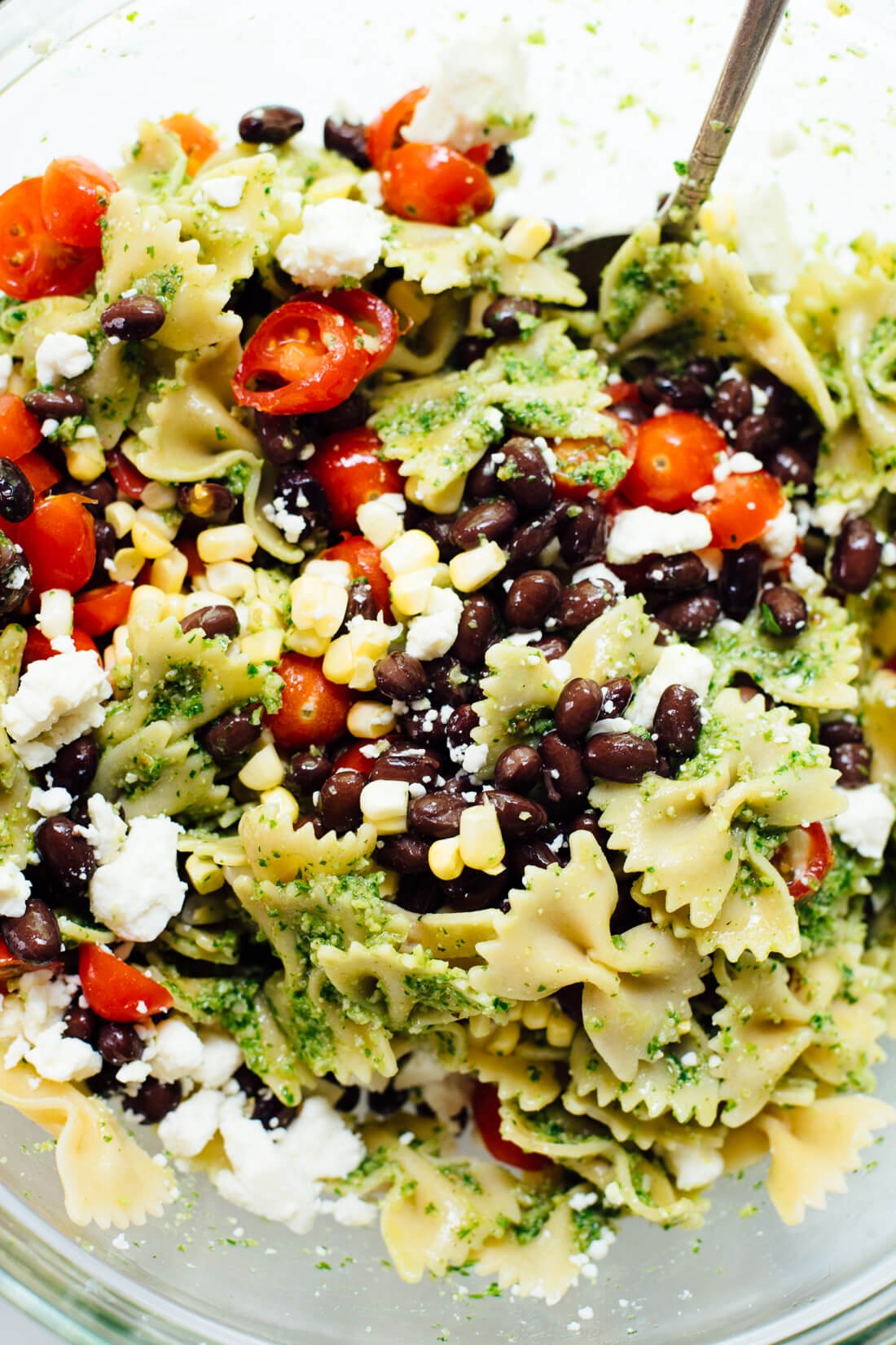 This healthy pasta salad features bold summer flavors, including tomatoes, corn and black beans tossed in spicy, fresh pesto! Itโ€™s a great vegetarian side dish for potlucks and barbecues. See paragraph above for variations and substitution suggestions! Recipe yields about 8 cups salad, which is enough for 4 main or 8 side servings.