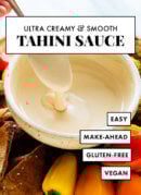 Learn how to make ultra creamy tahini sauce! The best tahini sauce is ultra creamy, deliciously tangy and irresistible. This recipe is easy to make, too. Youโll just need a whisk! Recipe yields 1 to 1 ยผ cup; double if desired.